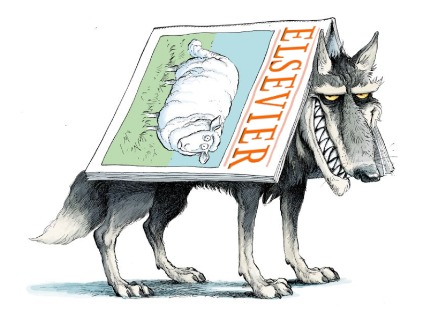 Illustration showing Elsevier as a wolf in sheep’s clothing: Read more about their “predatory transgressions on academia” here